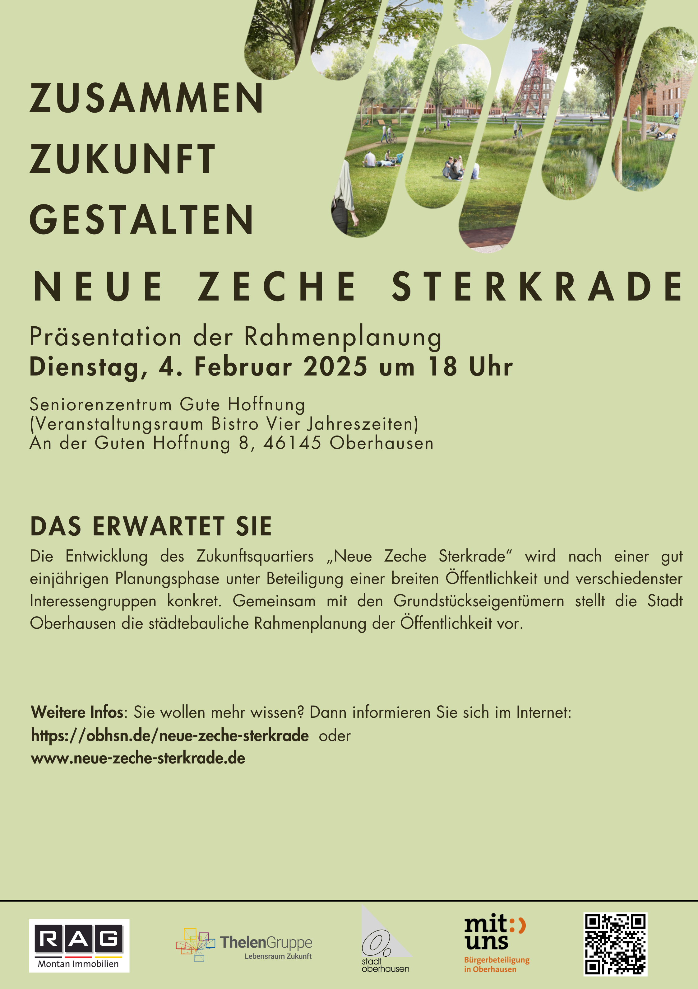 Auf Basis eines ersten Leitbildes und einer Planungsvereinbarung, die im Dezember 2023 geschlossen wurde, haben die Stadt Oberhausen und die Grundstückseigentümer einen intensiven Planungsprozess gestartet. Ziel ist, den ehemaligen Industriestandort Zeche Sterkrade zu einem attraktiven Quartier für Wohnen und dienstleistungsorientiertes Gewerbe zu entwickeln. Der Rat der Stadt hat diese planerische Ausrichtung im März 2024 nochmals bestätigt und darüber hinaus vorgegeben, dass dieser Prozess über ein breit angelegtes Bürgerdialogverfahren begleitet werden soll.
