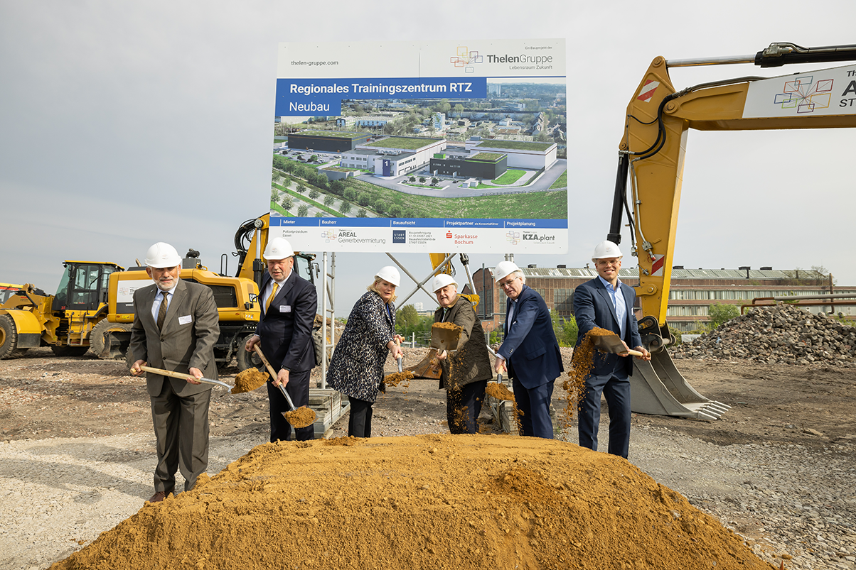 NRW-Innenminister Herbert Reul, Essens Polizeipräsident Frank Richter, Bochums Polizeipräsident Jörg Lukat und Bürgermeisterin Julia Jacob eröffneten am 29.04.2022 gemeinsam mit Wolfgang und Christoph Thelen mit einem symbolischen Spatenstich die Baustelle des RTZ am Berthold-Beitz-Boulevard im Essener Westviertel.